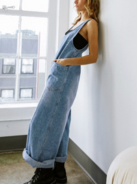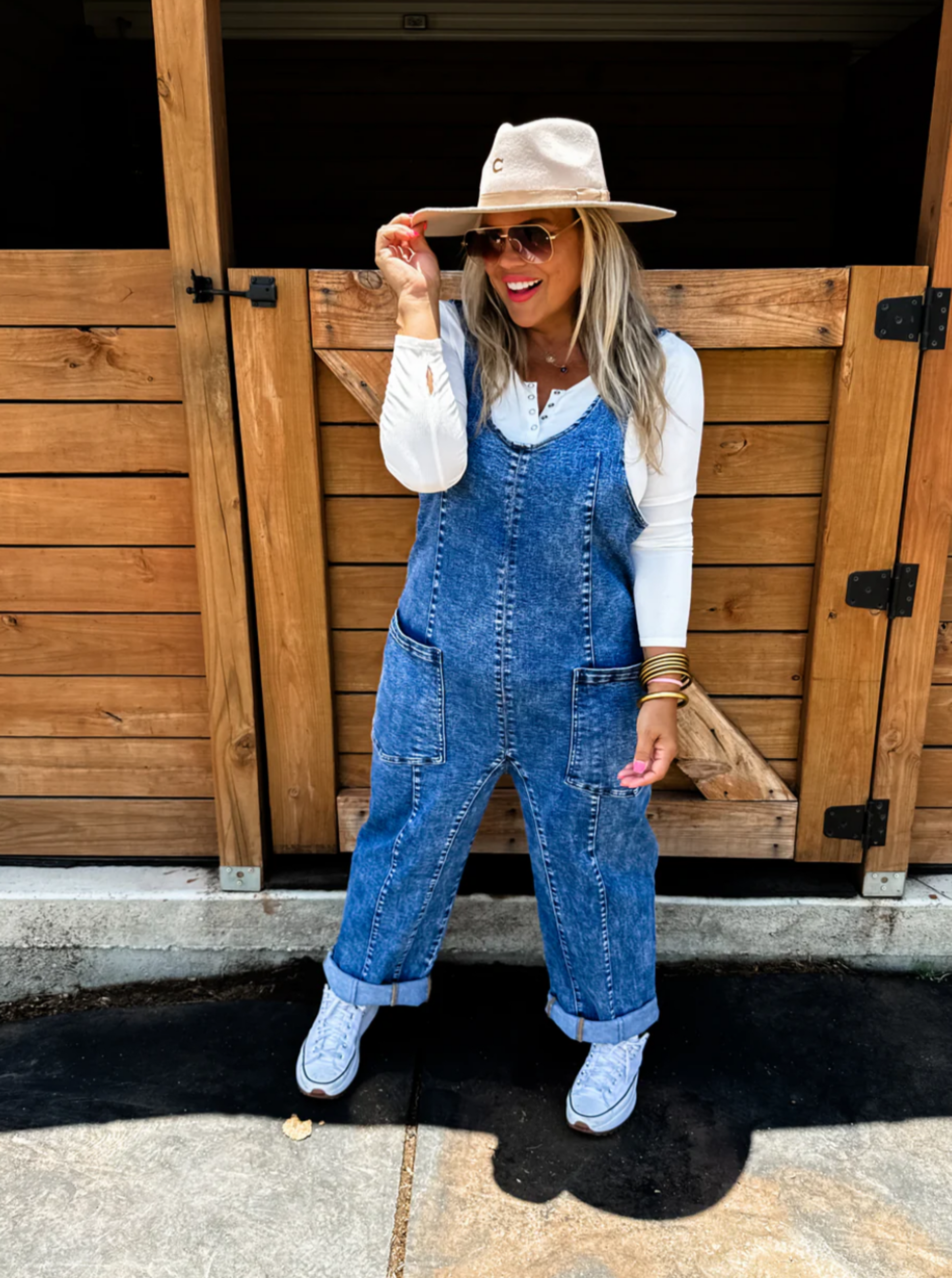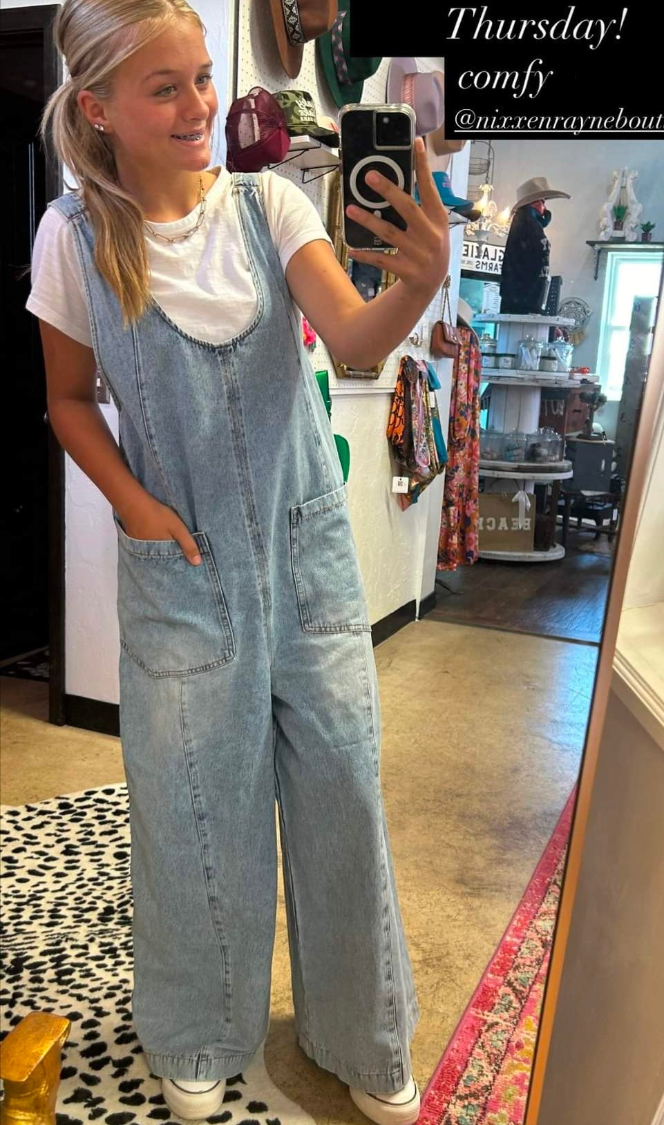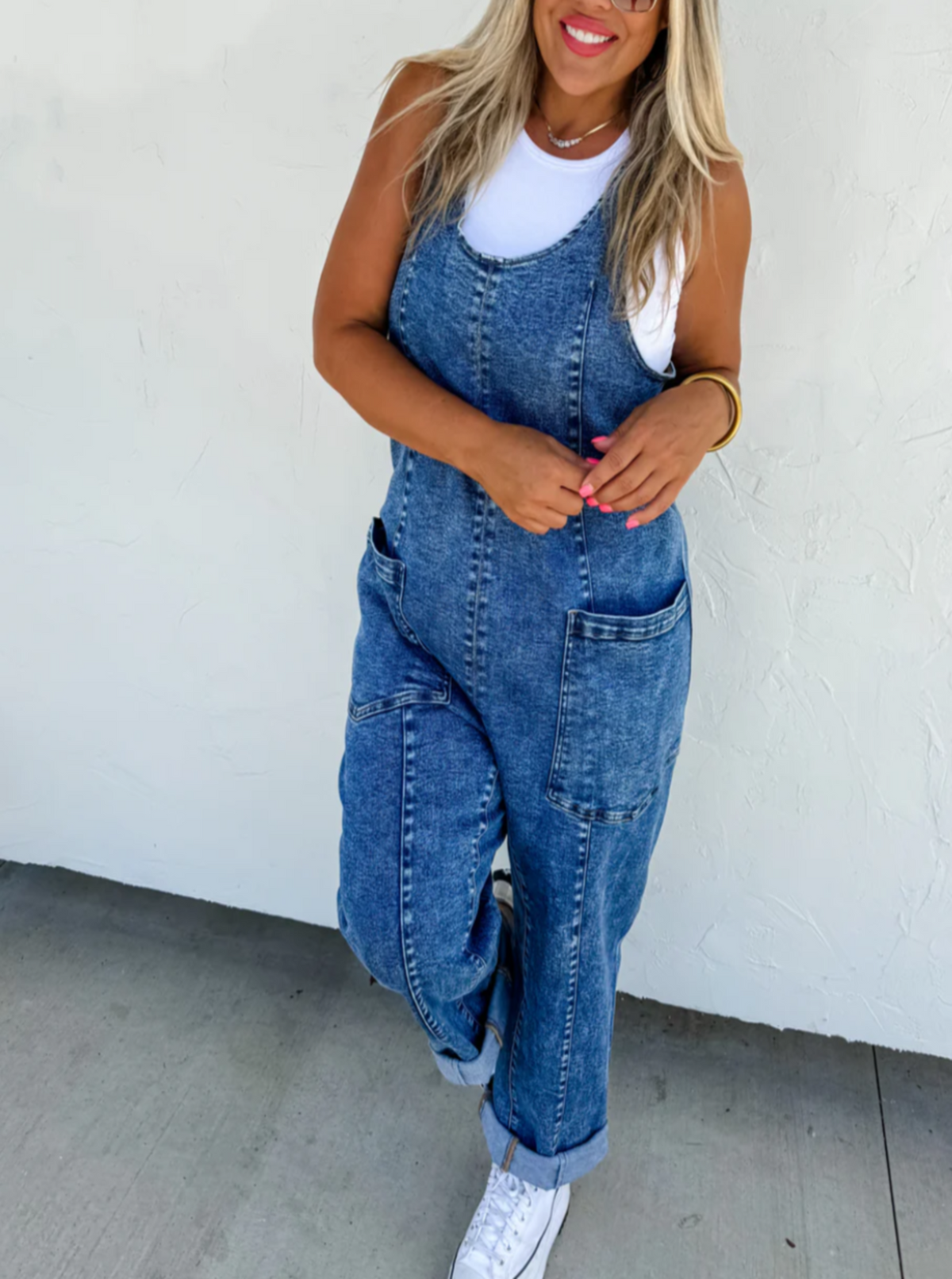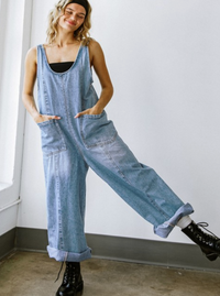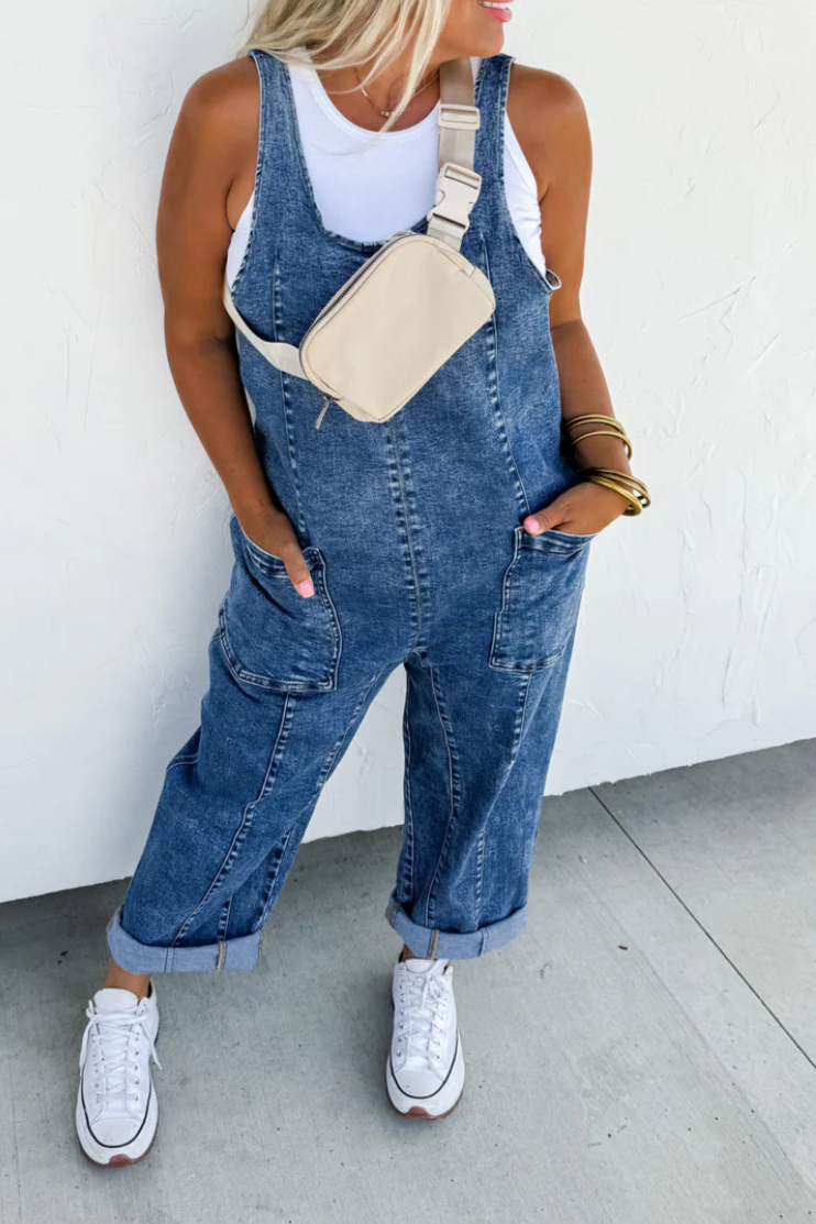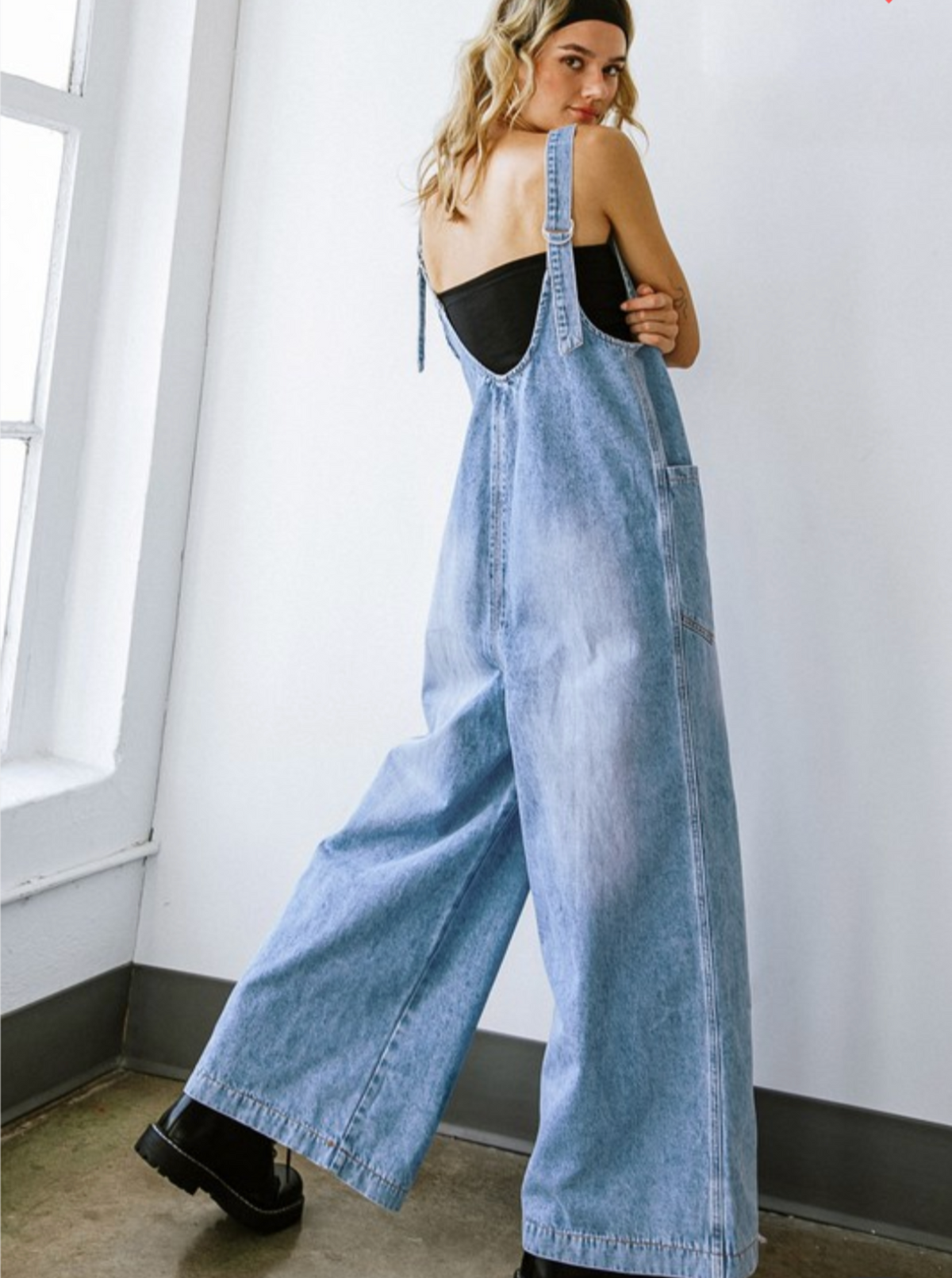 • Features: This Jumpsuit is a fun 90s-inspired piece! Made with distressed denim and featuring a flattering v-neck and roomy front pockets, this jumpsuit effortlessly embodies style. The flared legs and low back add flair, while the adjustable straps ensure the perfect fit!
