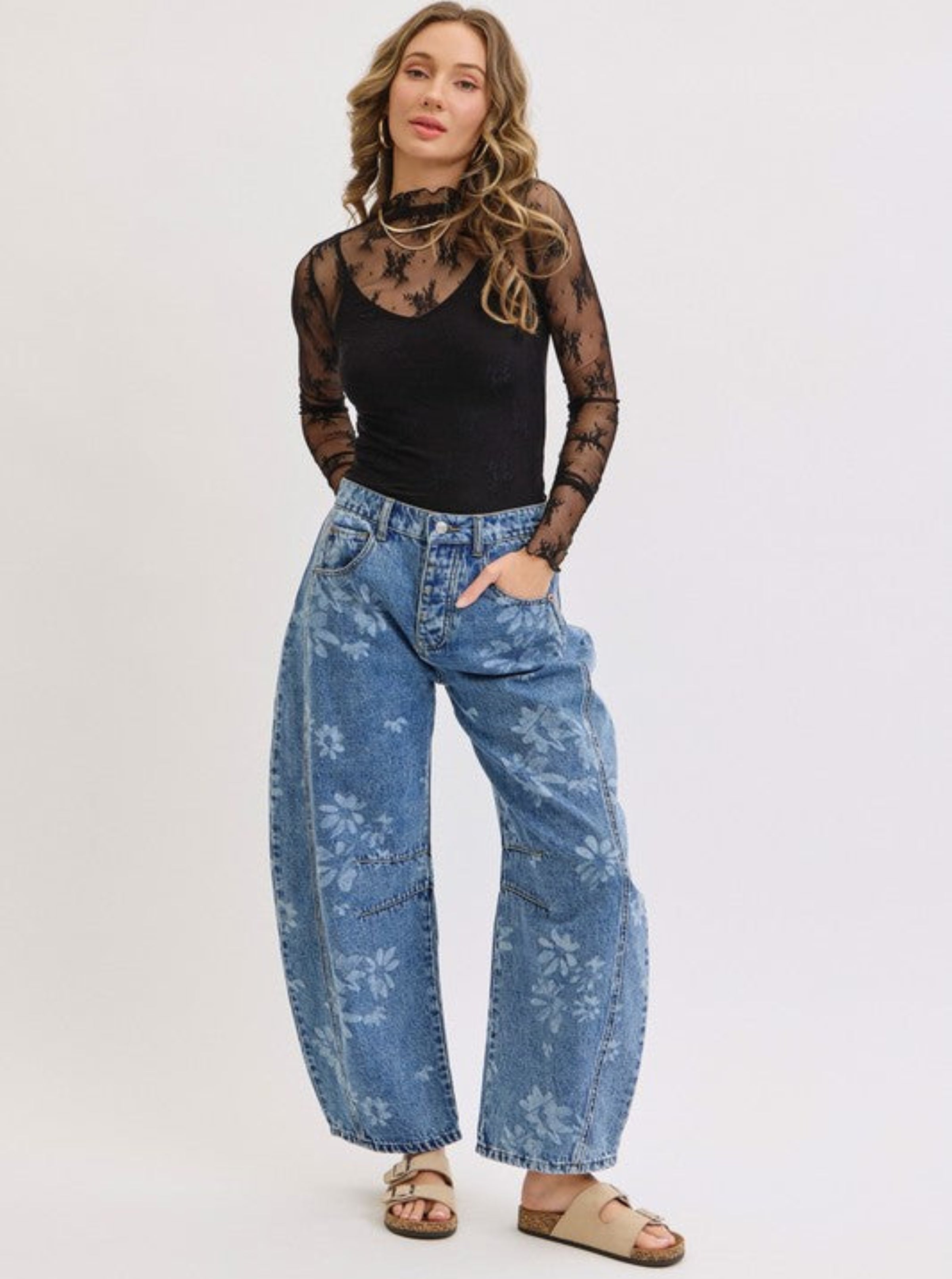 - Features: Floral bleach patterns bring playful artsy energy to these barrel jeans. Relaxed, loose fit with a roomy curved leg and high/mid-rise sits just right. Four-pocket style in printed denim that's fun and effortless!