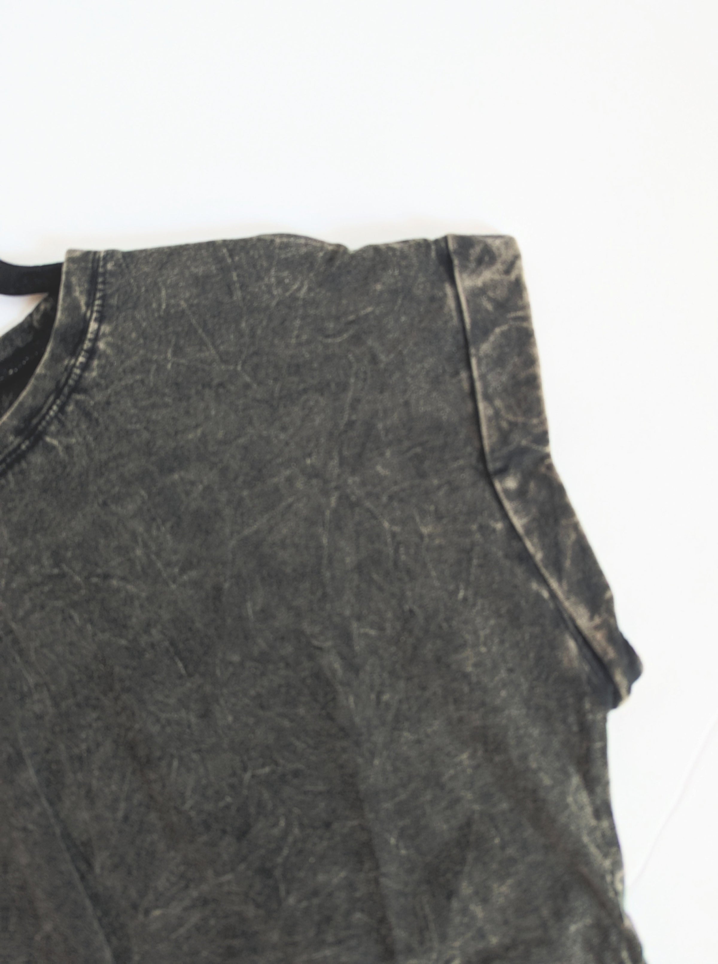 - Get ready to rock a unique look with this top! Featuring an acid wash design, a round neckline, and folded short sleeves, you'll stand out in style! Just remember that each piece is one-of-a-kind and may vary in color.