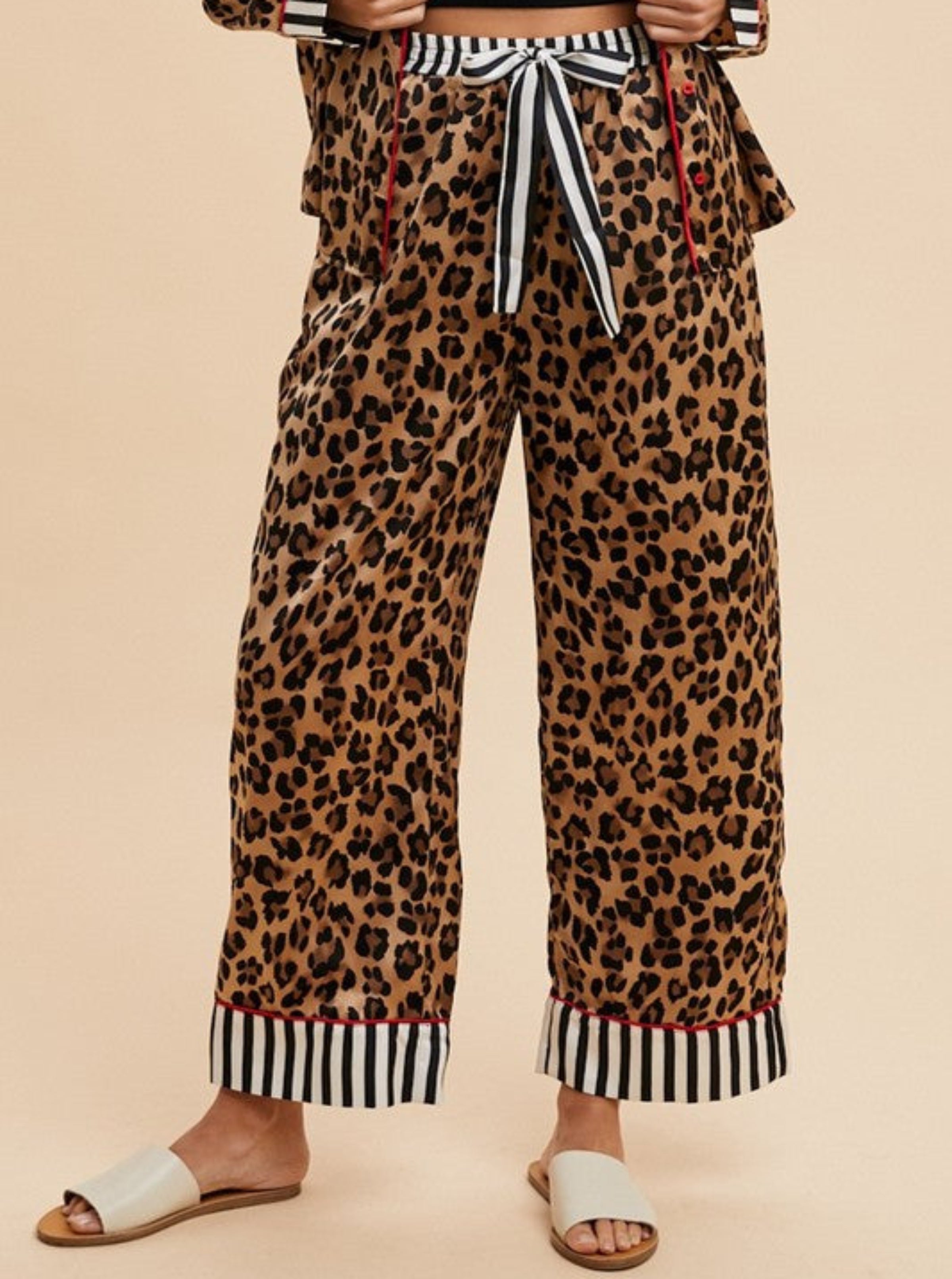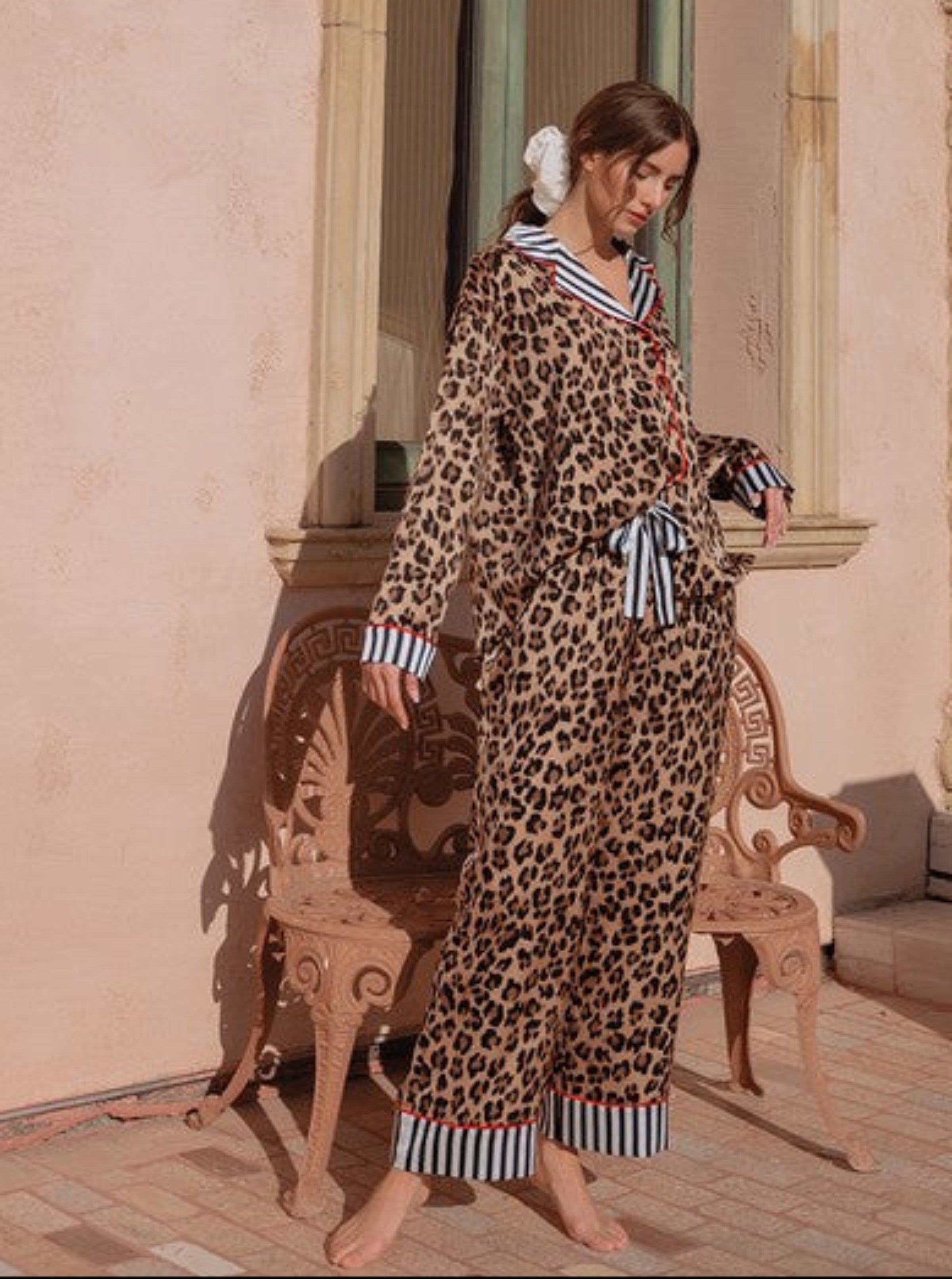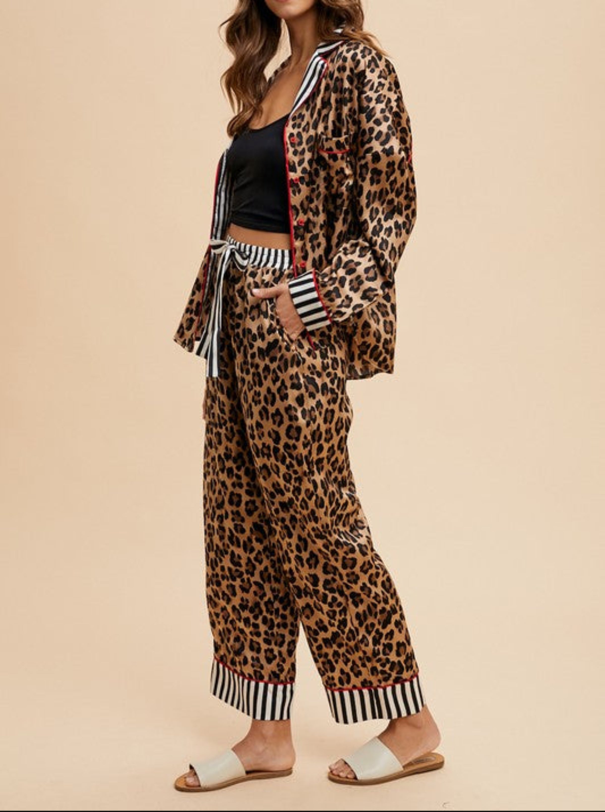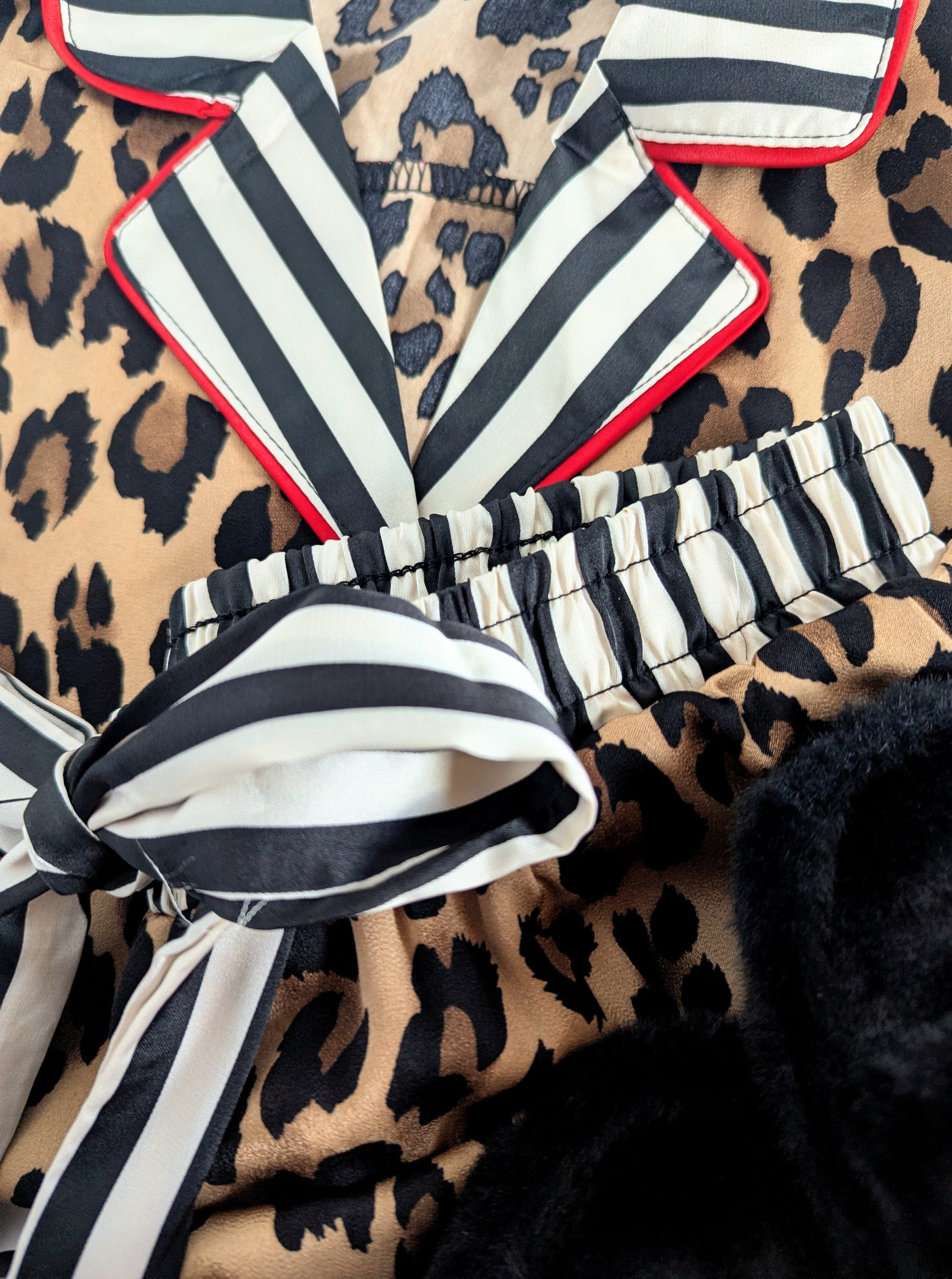 - Features: Elevate your sleepwear with this refined leopard satin pajama set. The coordinated button-down top and pants showcase a timeless leopard print enhanced by elegant striped detailing at the collar, cuffs, and waist tie. Sophisticated red piping and practical pockets complete this luxurious ensemble.